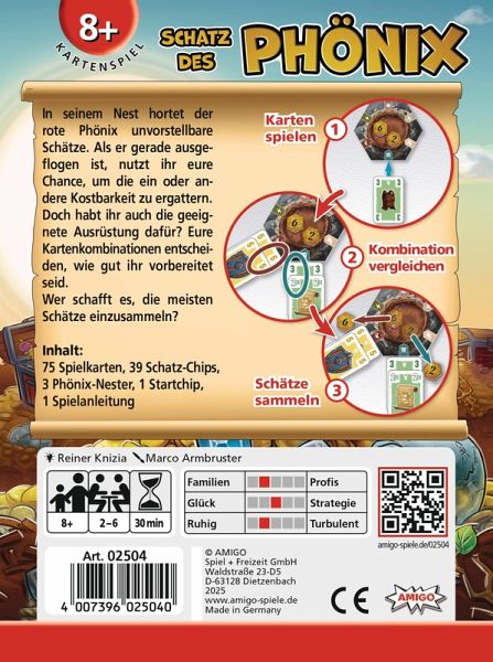 Legenden erzählen vom roten Phönix, der in seinem Nest unvorstellbare Schätze hortet. Als er gerade ausgeflogen ist, nutzt ihr eure Chance, um die ein oder andere Kostbarkeit zu ergattern. Doch habt ihr auch die geeignete Ausrüstung dafür? Eure Kartenkombinationen entscheiden, wie gut ihr vorbereitet seid. Ein schnell erlerntes Kartenspiel von Erfolgsautor Reiner Knizia.