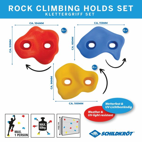Das Schildkröt Klettergriff Set besteht aus 12 Kunststoffklettergriffen (PP) in 3 verschiedenen Griffformen und Farben. Befestigungsmaterial nicht im Lieferumfang enthalten. Maximale Belastbarkeit: 50kg. Altersempfehlung 5+. Nur für den Hausgebrauch. Montage nur durch Erwachsene.