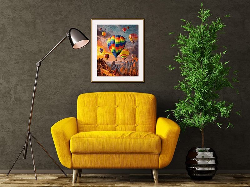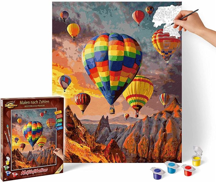 Farbenprächtige Heißluftballons vor der märchenhaften Kulisse Kappadokiens. Die von der aufgehenden Sonne angestrahlten kegelförmigen Gesteinsformationen verleihen der Landschaft ein bizarres und fast schon surreal anmutendes Aussehen. Es wird verstärkt durch die Vielzahl der bunten Heißluftballons und das Farbenspiel der Wolken am rötlich-blau gefärbten Himmel. Die in diesem Motiv festgehaltene einzigartige Atmosphäre macht das Hobbymalen zugleich zu einem sinnlichen Erlebnis.