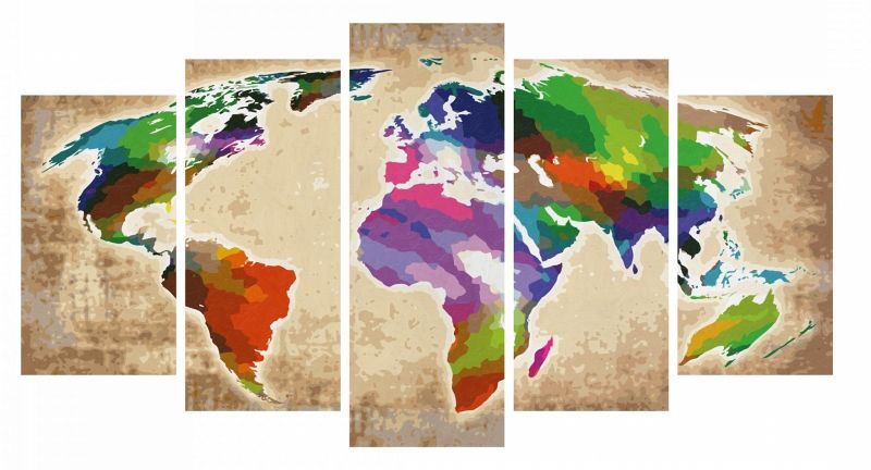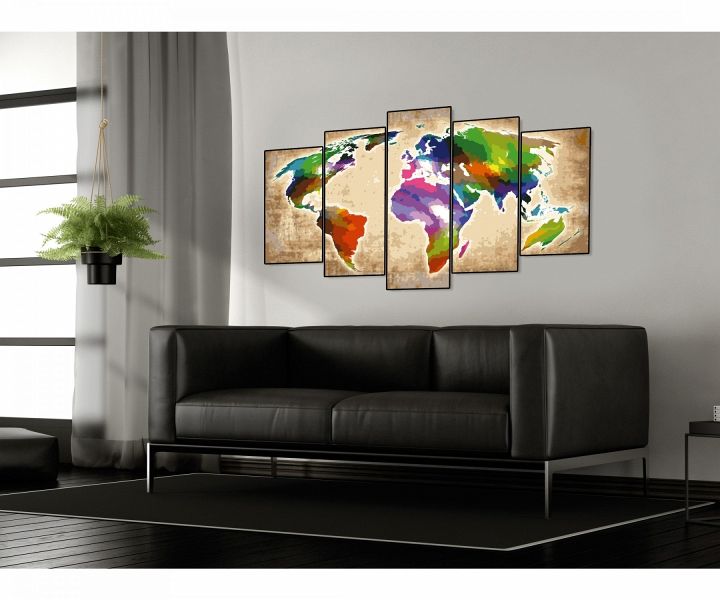 Die Weltkarte als farbenprächtiges abstraktes Kunstwerk. Als Hintergrund eine antike Weltkarte auf fleckigem Pergament. Die Satellitenaufnahme der Erdoberfläche wurde losgelöst von geographischen Gegebenheiten sowie Staaten- und Landesgrenzen farblich und gestalterisch verfremdet. Herausgekommen ist eine berauschende Mischung aus einer herrlich bunten Welt, die sich frech und lebensbejahend auf traditionellem Background präsentiert. Ein dekorativer Wandschmuck, der sich an keine realen Grenzen hält, und gerade deshalb einen Aufbruch in eine Colorful World" repräsentiert.