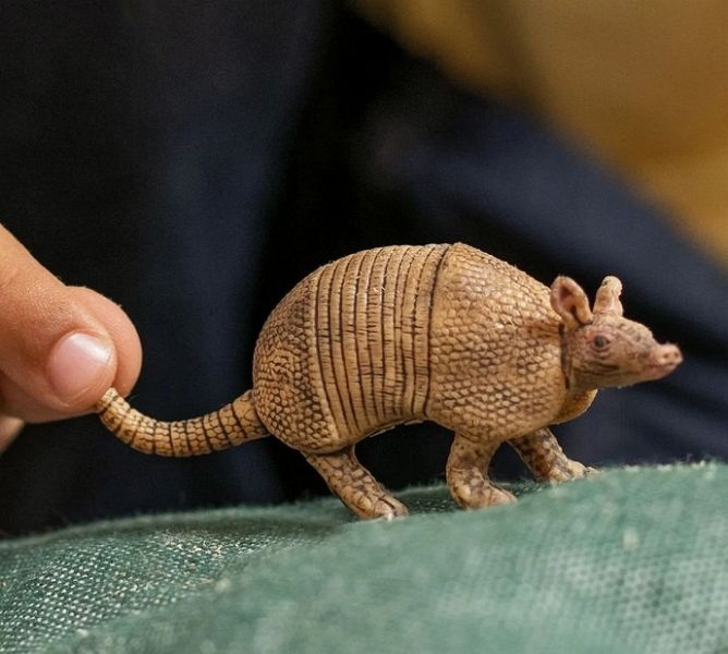 Einmalig sieht das Gürteltier mit seinem dicken Hornpanzer aus. Der bedeckt den ganzen Körper, nur die spitze Nase und die Augen liegen frei. Die lange Nase verrät es schon: Das Gürteltier kann sehr gut riechen und Insekten auch dann erschnüffeln. Wenn es die aus ihrem unterirdischen Bau ausgräbt, kann das Gürteltier dabei sechs Minuten lang die Luft anhalten! Hitze macht ihm nichts aus. Es ist in Südamerika zu Hause und heiße Tage gewohnt.