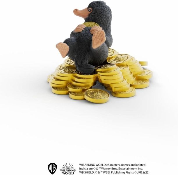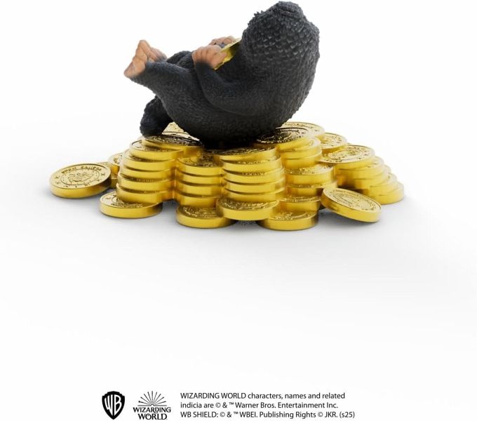 Der niedliche Niffler ist kaum von dem Goldhaufen zu trennen. Kein Wunder: Schließlich glitzern und glänzen die Münzen verführerisch. Dieses Fabelwesen kann einfach nicht widerstehen. Goldschimmer und Glitzer sind einfach seine Leidenschaft und ziehen ihn magisch an. Begeistert wälzt er sich in dem Goldhaufen und gluckst fröhlich. Dabei umklammert er eine Münze in seinen Armen. Verrückter kleiner Kerl. Ob man ihn wohl wieder von hier wegbekommt?