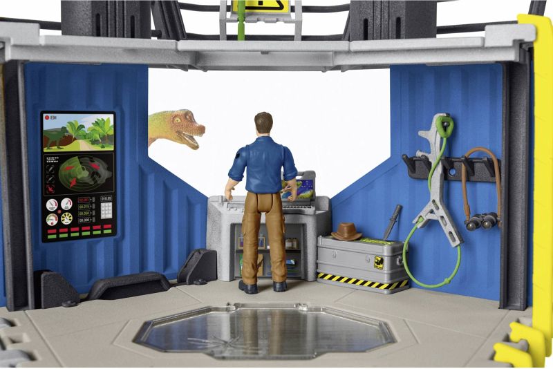 Forscher Maxx hat auf der großen Dino-Forschungsstation jede Menge zu tun. Die Station bietet neben der Kommandozentrale eine Aussichtsplattform mit schwenkbarer Betäubungspfeil-Kanone sowie einen Kran. Im unteren Bereich befindet sich ein Quarantäne-Raum für frisch eingefangene Dinos. Hier können sofort die ersten Untersuchungen gemacht werden und dann die Dinos durch die Falltür ins Gehege gelassen werden. Oh nein! Der Velociraptor ist ausgebrochen! Kann Maxx ihn mit seiner Stabwaffe wieder einfangen? Das Spielset bietet jede Menge Zubehör und 2 Dinos in cooler Bemalung.