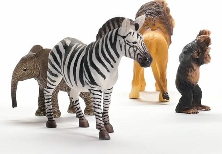 Die fantastischen Vier aus Afrika sind ein tolles Quartett. Das hübsch gestreifte Zebra lässt beim Grasen den Blick über die weite Savanne schweifen. Der prächtige Löwe mit seinen großen Tatzen steht selbstbewusst auf einem Hügel und überblickt die Weite. In der Ferne sieht er das Elefantenjunge auf dem Weg zur Wasserstelle. Das Schimpansenjunge hebt ratlos die langen Arme: Wer spielt mit mir? 1x Großer Panda, 1x Schimpanse, 1x Asiatisches Elefantenbaby, 1x Tiger Junges Ab 3 Jahren.