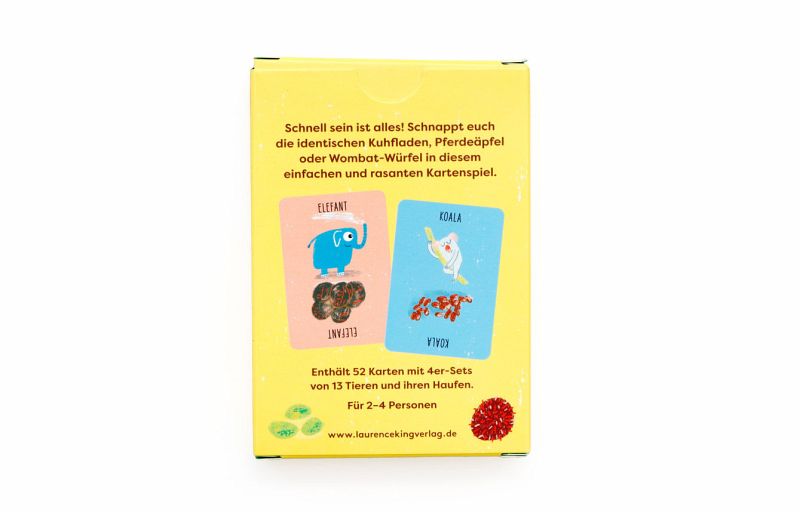 > Neuer Titel unserer lustigen Lernspiel-Reihe zu den Themen Pupse & Tierkacke > Ein rasantes Kartenspiel für die ganze Familie > Einfach zu verstehen für Kinder jedes Alters Schnell sein ist alles! Die Karten werden gleichmäßig unter den Spielenden aufgeteilt und verdeckt als Stapel gehalten. Die Spielenden decken ihre obersten Karten gleichzeitig auf und legen sie auf einen Stapel in der Mitte. Wer eine Zwillingskarte entdeckt und als Erste_r SCHNAPP ruft, gewinnt alle Karten aus dem Mittelstapel. Wer sämtliche Karten gesammelt hat, gewinnt das Spiel.