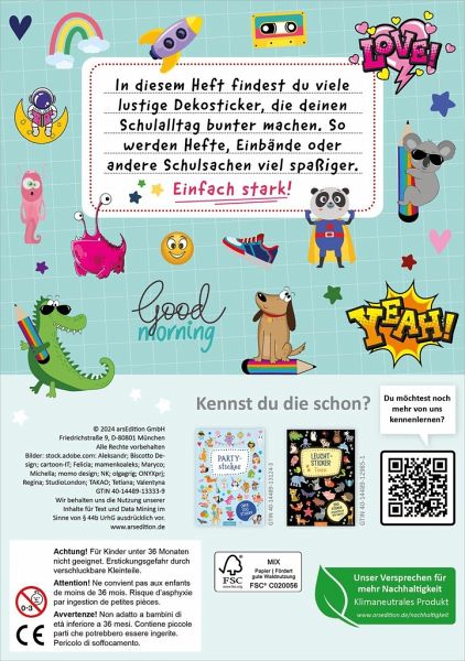 In diesem Heft findest du viele lustige Dekosticker, die deinen Schulalltag bunter machen. So werden Hefte, Einbände oder andere Schulsachen viel spaßiger. Einfach stark!