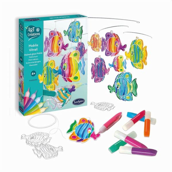 Bastelset zum Herstellen von schönen Fisch-Glasmalereien, durch Einspritzen der gewählten Farben in die dekorativen Rahmenhalterungen. Inhalt: 8 Plexiglas-Fische, 4 Mobilehänger, transparente Nylonschnüre, 10 Buntglasfarben und eine Anleitung.
