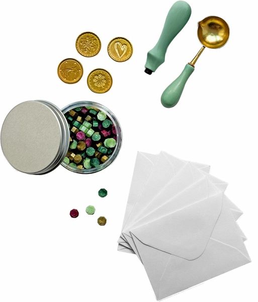 Bis zu 50 wunderschöne Wachssiegel ruck, zuck selber machen! Dieses Set enthält alles, was man braucht, um Briefe, Geschenke oder Einladungen mit Wachssiegeln zu verzieren: Wachsplättchen in 4 Metallic-Farben, 1 Schmelzlöffel, 1 Stempel-Griff, 4 Stempel-Motive, 5 Mini-Briefumschläge und 1 Anleitung. Perfekt für alle, die ihren Botschaften einen persönlichen Stempel aufdrücken möchten.