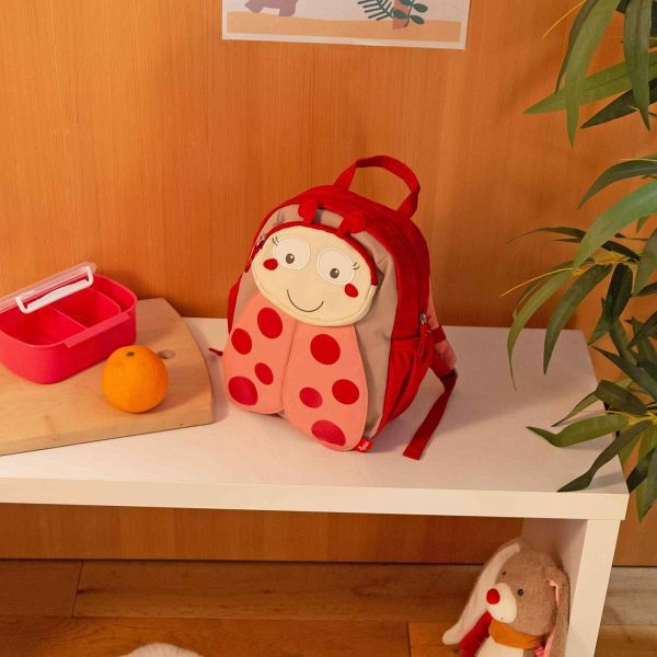 Die extravagante Kindertasche mit süßem Marienkäfer-Design in Rot und Beige bietet ausreichend Platz für eine Brotzeitbox, Trinkflasche, ein Kuscheltier oder andere wichtige Utensilien. Das große Hauptfach ist mit einem Doppelreißverschluss versehen, der sich leichtgängig öffnen und schließen lässt. Es ist innen nochmals hochwertig abgefüttert und mit einem weiteren kleinen Reißverschlussfach ausgestattet. Seitlich sind zwei Einschubtaschen angebracht, die z.B. Trinkflaschen aufnehmen können. Besonders witzig: Hinter dem bestickten Gesicht des Käferchens verbirgt sich eine ovale kleine Tasche, und seine mit Klett befestigten Flügel verdecken ein Namensschild, auf dem der kleine Besitzer vermerkt werden kann.