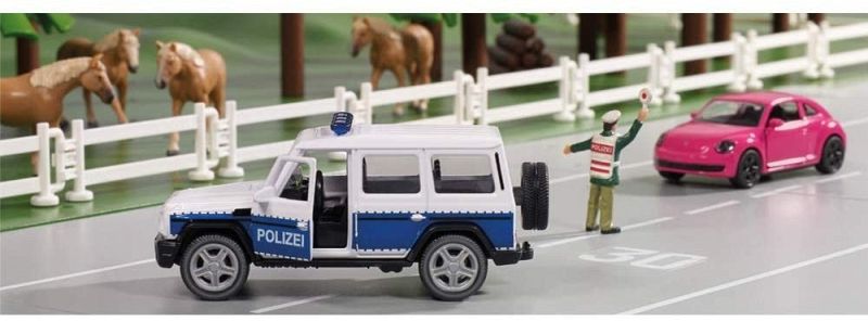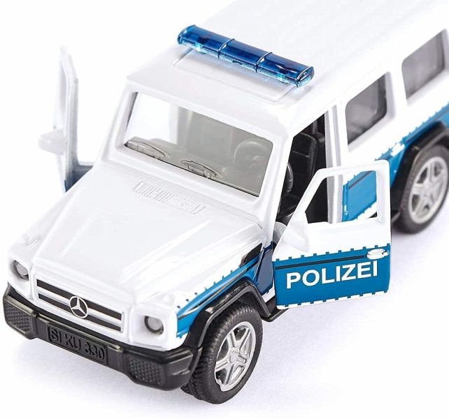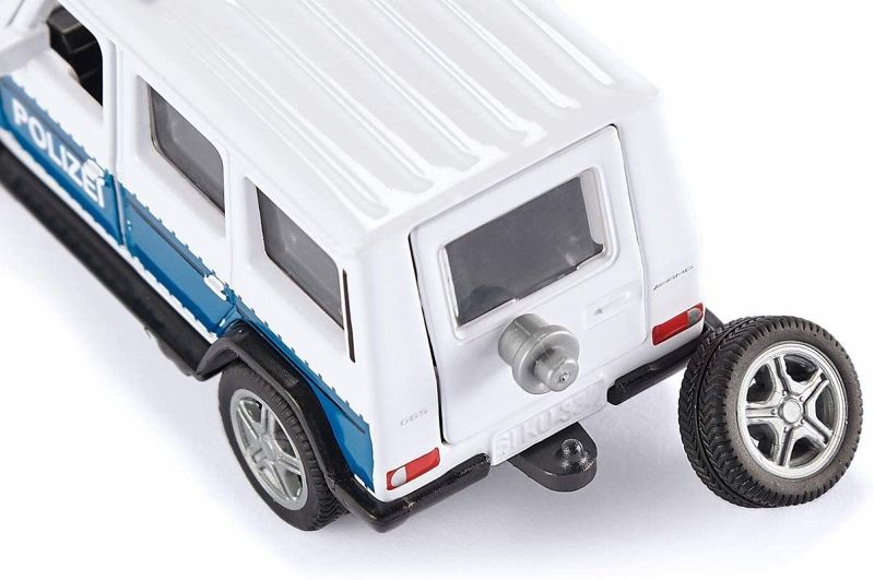 Detailliertes Spielzeugmodell eines Mercedes-AMG G65 Polizeiauto mit Anhängerkupplung zum Spielen und Sammeln - Robustes und stabiles Design, Anhängerkupplung, Abnehm- und austauschbare Räder, Öffenbare Türen, Heckklappe und Motorhaube - Langanhaltender Spielspaß durch unzählige Kombinationsmöglichkeiten innerhalb der SIKU Spielwelt, z. B. durch Kombination mit unterschiedlichen Reifen - Ideal als Geschenk für kleine und große Polizei-Fans geeignet, Perfekte Ergänzung zu SIKU Spielwelten - Lieferumfang: 1x SIKU 2308 Mercedes-AMG G 65 Polizeiauto, Maßstab: 1:50, Material: Metall/Kunststoff, Abmessungen: 12,1 x 4,3 x 4,2 cm, Gewicht: 0,126 kg, Farbe: Blau/Weiß, Serie: SIKU SUPER