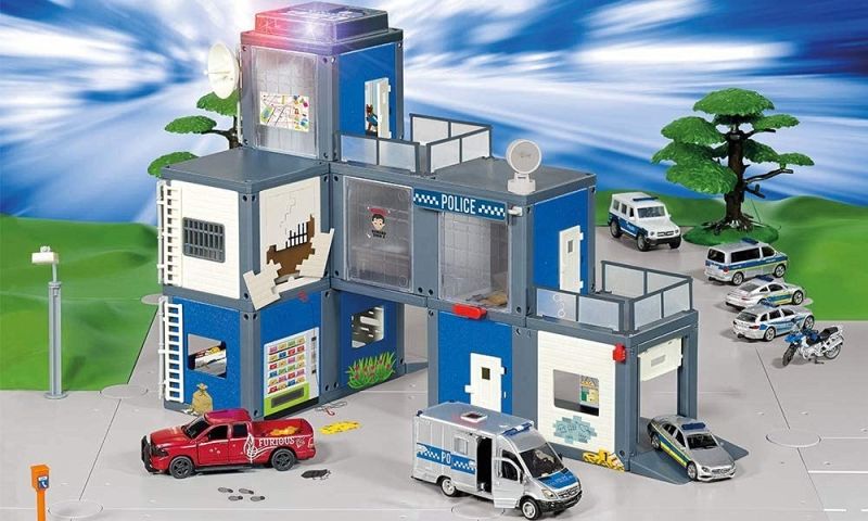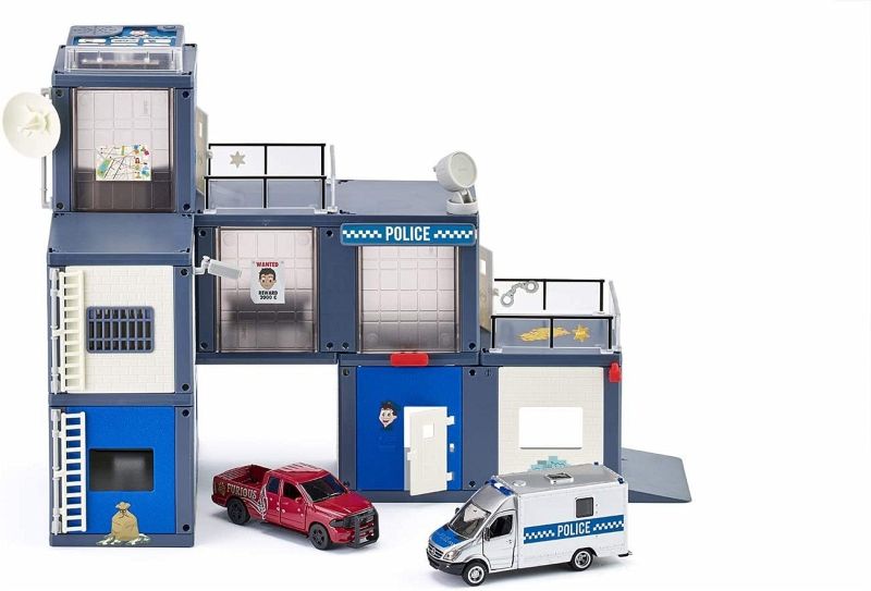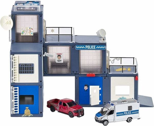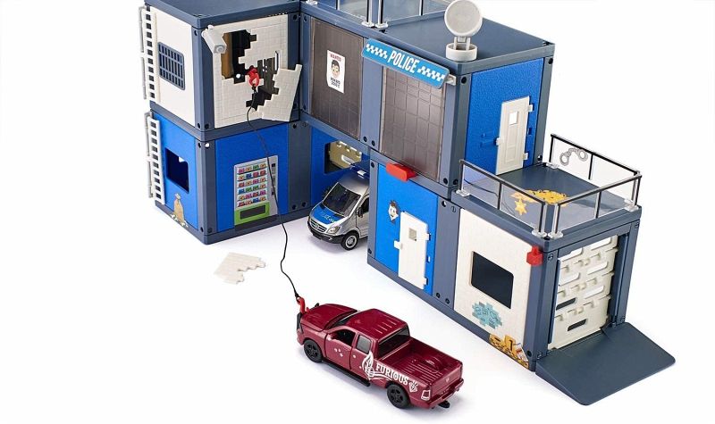 Crimetime in der SIKUWORLD: Gefängnisausbruch. Die Gangster haben mit einem an einem Dodge RAM 1500 befestigten Seil eine Wand herausgerissen und dem Komplizen zur Flucht verholfen. Der Gefängnishof ist hell erleuchtet. Die Polizei rückt mit einem Mercedes-Benz Sprinter mit Kofferaufbau an, die Beamten liefern sich einen Schusswechsel mit den Gangstern und treffen den großen Pick-up in den Seitentüren. Dennoch gelingt es den Gangstern, zu fliehen. Mit dem Light & Sound Modul entsteht eine filmreife Szenerie in der SIKUWORLD. Mit der neuen Polizeistation wächst die SIKUWORLD weiter. Das dreigeschossige Gebäude kann nach der anschaulich bebilderten Anleitung zusammengesteckt werden. Aus den Bauelementen entstehen auch ganz individuelle Gebäude in L- oder U-Form oder wachsen zu einem mehrgeschossigen Gebäude empor. Der modulare Aufbau und die Stabilität des Stecksystems setzen der Kreativität der Kinder keine Grenzen. Das siku Stecksystem fördert dabei spielerisch die motorischen und kognitiven Fähigkeiten des Kindes. Die Möglichkeit, ohne Hilfe von Erwachsenen etwas zu erschaffen, stärkt zudem das Selbstbewusstsein.Die SIKUWORLD Polizeistation ist kompatibel mit den anderen Sets der SIKUWORLD, ist aber auch allein bespielbar. Enthalten sind Bauelemente wie Wände mit Gitterfenstern für die Aufenthalts- und Diensträume der Polizei und für den Zellentrakt. Das dreigeschossige Gebäude mit einer Dachterrasse ist in der siku-typischen Weise mit Antenne, Falltür, Leitern, einem nachleuchtenden Suchscheinwerfer, Satellitenanlage, Tisch und Stühlen und einer Überwachungskamera detailliert ausgestattet. Natürlich lässt sich die Fahrzeugflotte mit den vielen siku Polizeifahrzeugen vergrößern.