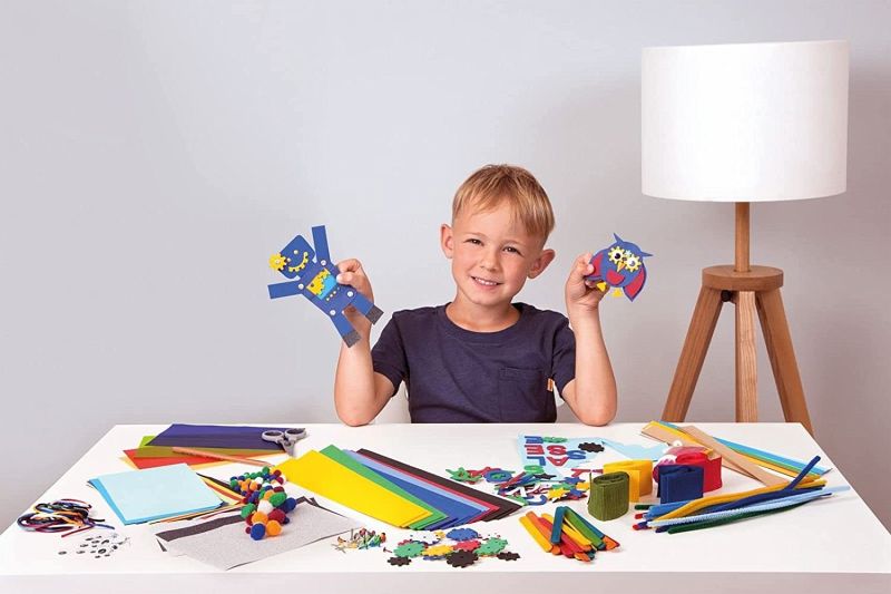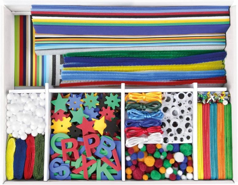 Der Bastelkoffer enthält buntes & transparentes Papier, Moosgummiteile, Pfeifenreiniger, Wackelaugen, Pompons, bunte Eisstiele, Styroporkugeln, Bänder und vieles mehr in verschiedenen Blau- und Grün-Farbtönen.