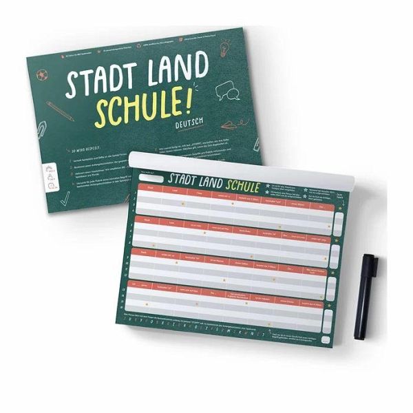 Stadt Land Schule fordert und fördert Konzentration und Wissen. Die Spielkategorien trainieren den Wortschatz und steigern die Freude am selbstständigen Umgang mit Sprache. Enthält: 1x A4 Block mit 50 Blatt.