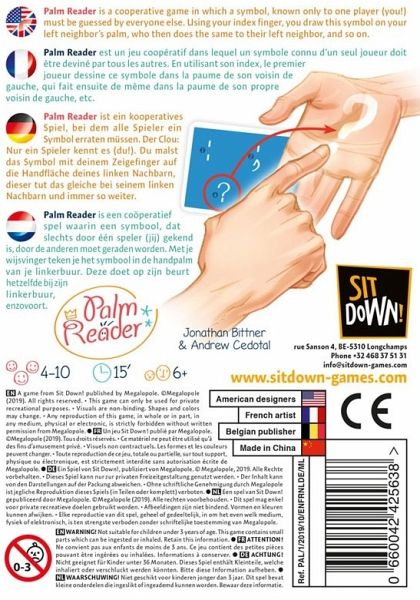 Palm Reader ist ein kooperatives Spiel, bei dem ein Spieler alle anderen Spieler dazu bringen muss, ein bestimmtes Symbol zu erraten. Ihr malt das Symbol mit eurem Zeigefinger auf die Handfläche eures linken Nachbarn, der es wiederum auf die Handfläche seines linken Nachbarn malt usw. Da niemand sieht, was gemalt wird, müsst ihr euch ganz auf euer Gespür verlassen. Alle versuchen zusammen, möglichst viele Punkte zu erreichen.
