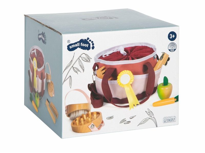 Eine Pferdeputztasche mit Zubehör für alle Spielpferde, Holzpferde und Hobby Horses! Die Pferdepflege gehört für jeden Pferdefan zum Alltag und auch das Steckenpferd oder das Holzpony im Garten freut sich, wenn es gebürstet wird. Mit der schicken Reitertasche aus Stoff in ansprechenden Rosa- und Beerentönen inkl. Putzzeug aus stabilem Holz ist für die Pferdepflege immer alles griffbereit und auch unterwegs sicher verstaut. Im geräumigen Innenteil der Pferdeputztasche und in den kleinen Seitentaschen findet das gesamte Zubehör aus Bürste, Striegel, Hufkratzer mit Bürste und Mähnenkamm seinen Platz. Und auch der Apfel und die Möhre aus Holz dürfen zur Belohnung als Leckerli nicht fehlen! Mit selbst zu gestaltender Turnierschleife, die Kinder am Halfter ihres Pferdes oder an ihrer eigenen Kleidung befestigen können. Damit die kleinen Reiterinnen und Reiter ihre Fantasie beim Hobby Horsing voll ausleben können, ist das Pferdeputzzeug in der Tasche perfekt auf die Bedürfnisse junger Pferdeliebhaber zugeschnitten. Der praktische Kordelzug sorgt dafür, dass die Tasche besonders weit geöffnet, aber auch vollständig geschlossen werden kann. Das kindgerechte Täschchen lässt sich an den beiden Henkeln und dem verstellbaren Schulterriemen bequem tragen. Mit dem Pflegeset können Kinder ihr Lieblingsholzpferd oder Steckenpferd im realitätsnahen Rollenspiel pflegen wie echte Profis! Die speziell entwickelte Putz- und Zubehörtasche ist ideal für kleine Kinderhände geeignet und mit den beigelegten Stickern kann die Turnierschleife individuell verziert werden.