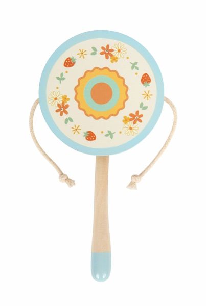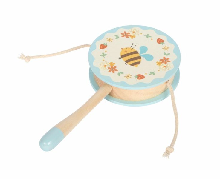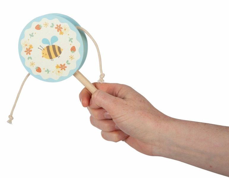 Rhythmus im Handumdrehen! Diese handliche Trommel sorgt für rhythmischen Spielspaß und fördert ganz nebenbei die Hand-Auge-Koordination. Auch bekannt als Rasseltrommel ist dieses fröhliche Musikspielzeug mit Blumen- und Bienenmotiv ein vielseitiger Begleiter für erste Klangerfahrungen und motorisches Training. Mit jeder Drehung ertönt ein klapperndes Geräusch, das zum Mitmachen und Ausprobieren einlädt! Ein traditionelles Musikspielzeug, liebevoll gestaltet, funktional durchdacht und perfekt für kleine Kinderhände. Am Holzstiel gehalten, lässt sich die Trommel durch einfaches Drehen in Bewegung setzen. Dabei schlagen zwei befestigte Holzkugeln abwechselnd gegen die Trommelflächen und erzeugen ein rhythmisches Trommelgeräusch.