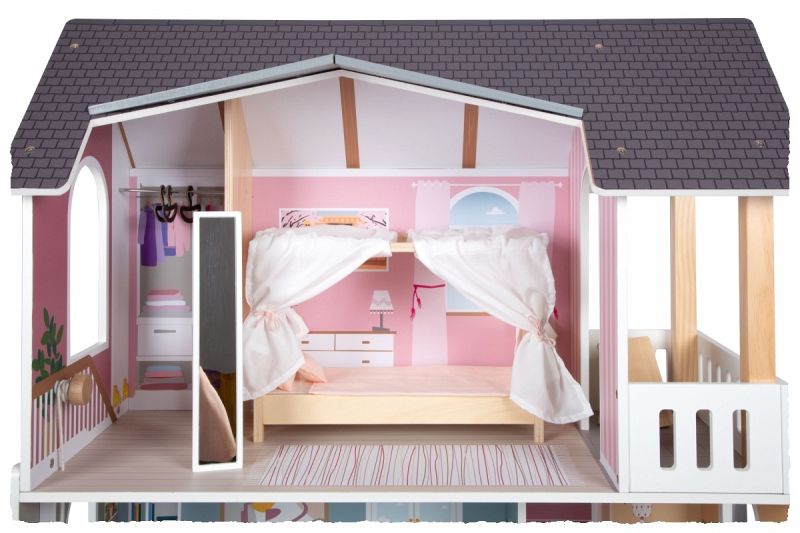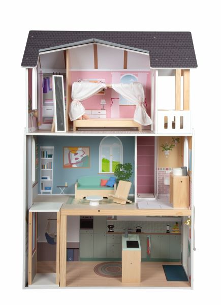 Ein Traumhaus zum Verlieben! Die Puppenhaus Traumvilla XL bietet ein exklusives Zuhause für alle Modepuppen bis 30 cm im Maßstab 1:6 und ist mit umfangreicher Ausstattung sofort bereit zum Losspielen! Mit drei geräumigen Etagen, offener Front und moderner Holzoptik schafft sie eine realistische Wohnwelt, in der Kinder ihre Fantasie ausleben können. Das gradlinige Haus begeistert mit einer hellen Außenfassade, dezenter Farbgestaltung, sichtbarem Vollholzanteil und vielen detailreichen Wandillustrationen, die jedem Raum lebendig wirken lassen ein ästhetisches Design, das sich harmonisch in moderne Wohn- oder Kinderzimmerumgebungen einfügt. Herzstück des Hauses ist der funktionsfähige Aufzug, der die Anziehpuppen und Fashion Dolls per Drehbewegung bequem von der ersten zur zweiten Etage transportiert. Ein echtes Highlight für kreative Rollenspiele ist das Ankleidezimmer im Dachgeschoss mit begehbarem Kleiderschrank, Kleiderstange und 5 Kleiderbügeln für Puppenkleidung im Maßstab 1:6. Der große Standspiegel und das romantische Himmelbett mit Vorhang runden das Styling perfekt ab. Das Badezimmer punktet mit besonderen Details wie Acrylglas-Duschwand, hängender Toilette mit klappbarem WC-Deckel und einem modernen Aufsatzwaschbecken. Auf der mittleren Etage laden Wohnzimmermöbel mit Couch, zwei Sesseln und einem Tisch zum Verweilen ein, die auch auf dem Balkon eine gute Figur machen. Eine durchdachte Kücheninsel mit zwei Schubladen und eine echte Glocke, mit der sich Besuch ankündigt, machen den Spielspaß perfekt. Durch die offene Front ist das Puppenhaus optimal bespielbar auch von mehreren Kindern gleichzeitig. Ob beim Einrichten, Umstylen oder Geschichten-Erfinden: Im Puppenhaus beginnt das Spielabenteuer, bei dem kein Tag dem anderen gleicht. Die Traumvilla ist ein Ort, an dem Kreativität blüht. Ganz nebenbei werden durch das freie Spiel motorische, sprachliche und soziale Kompetenzen gefördert.
