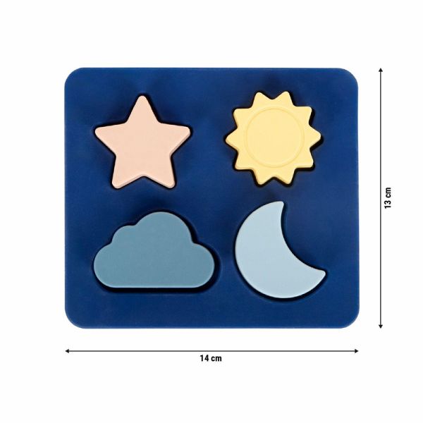 Puzzeln, stecken, entdecken - sicher und vielseitig! Dieses besonders kleinkindgerechte Setzpuzzle aus weichem, BPA-freiem Silikon lädt kleine Entdecker ab dem ersten Puzzleversuch ein, ihre Feinmotorik, Geduld und Konzentration spielerisch zu trainieren. Mit vier liebevoll gestalteten Puzzleteilen - Sonne, Mond, Wolke und Stern - können Kinder ihre Hand-Augen-Koordination stärken und beim Stecken unterschiedliche Formen erkennen und zuordnen. Einige der vier griffigen Puzzleteile lassen sich wahlweise mit der offenen oder geschlossenen Seite nach unten in die Puzzlebasis stecken und schaffen so unterschiedliche optische Reize - ein Plus für die visuelle Wahrnehmung und die Fantasie der Kinder. Die unzerbrechlichen, flexiblen Teile sind perfekt für kleine Hände, absolut sicher und können sogar im Wasser oder Sand verwendet werden. Dank des kompakten Designs ist das Puzzle ideal zum Mitnehmen und sorgt auch unterwegs für sinnvolle Beschäftigung. Das Silikon Setzpuzzle ist mehr als nur ein erstes Puzzle - es ist ein vielseitiges Lernspielzeug, das Kleinkinder spielerisch in ihrer motorischen und kognitiven Entwicklung unterstützt. Gefertigt aus hochwertigem, lebensmittelechtem Silikon ist das Puzzle weich, flexibel und frei von scharfen Kanten oder harten Ecken. Ob zu Hause, im Sandkasten, am Wasserspieltisch oder in der Badewanne: Dieses Setzpuzzle ist vielseitig einsetzbar und lässt sich dank seines kompakten Formats bequem überallhin mitnehmen. Es eignet sich ideal zur Beschäftigung unterwegs und bietet Kindern eine sichere und kreative Spielmöglichkeit, bei der sie sich selbstständig ausprobieren können. Das Puzzle lässt sich leicht reinigen.