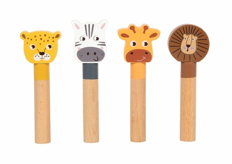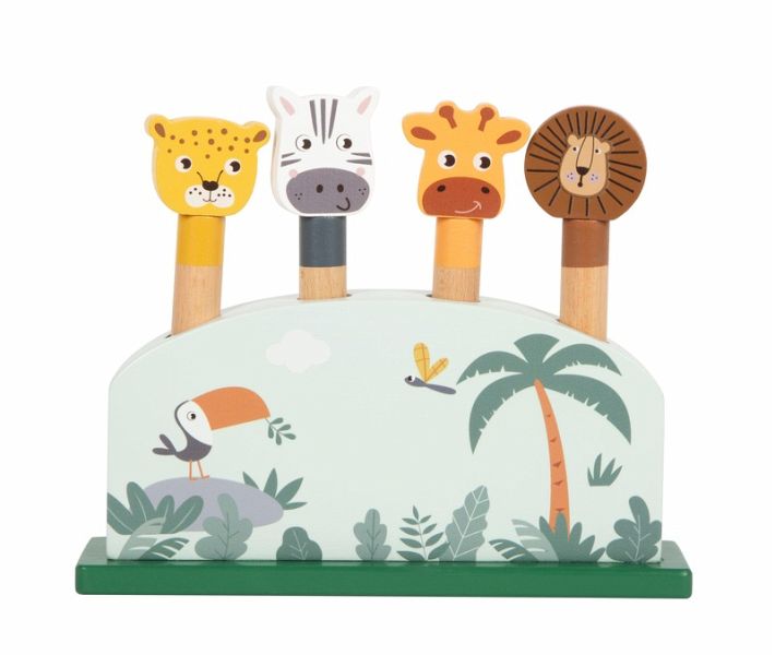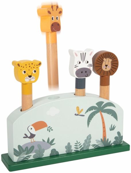 Tierischer Springspaß! Bei diesem fröhlichen Steckspiel aus FSC® 100%-zertifiziertem Holz warten vier lustige Safaritiere darauf, mit einem kräftigen Druck in die Höhe zu hüpfen. Das Motorikspielzeug begeistert mit liebevoll gestalteten Tierfiguren aus robustem Holz, die in die vorgesehenen Öffnungen gesteckt und durch Federmechanismen schwungvoll nach oben katapultiert werden können. Giraffe, Löwe, Zebra und Leopard jedes Tier bringt Spielspaß und fördert die Konzentration sowie das gezielte Greifen. Ein Spielvergnügen mit Überraschungseffekt, das nebenbei die Feinmotorik sowie die Hand-Auge-Koordination fördert ideal für kleine Entdecker:innen! Die moderne Farbgebung, der hohe Naturholzanteil und die kindgerechten Motive machen das Motorikspiel auch optisch zu einem Highlight im Kinderzimmer.