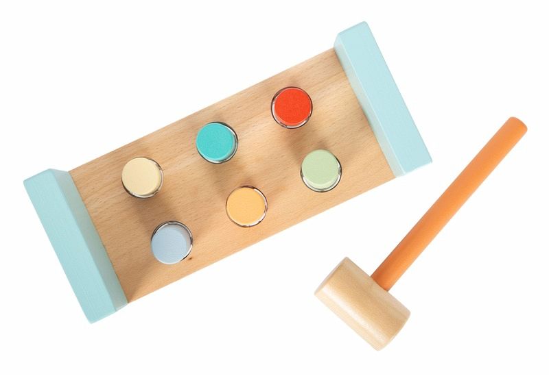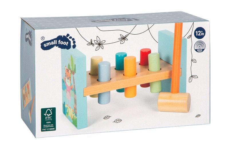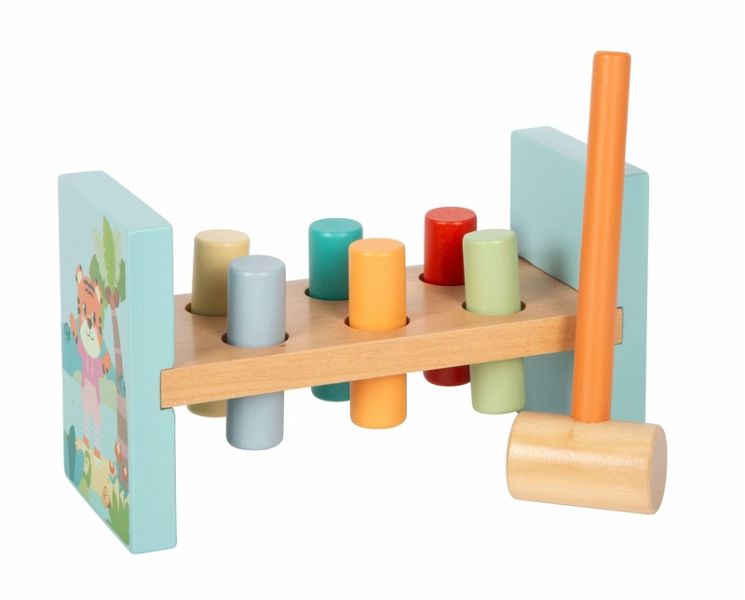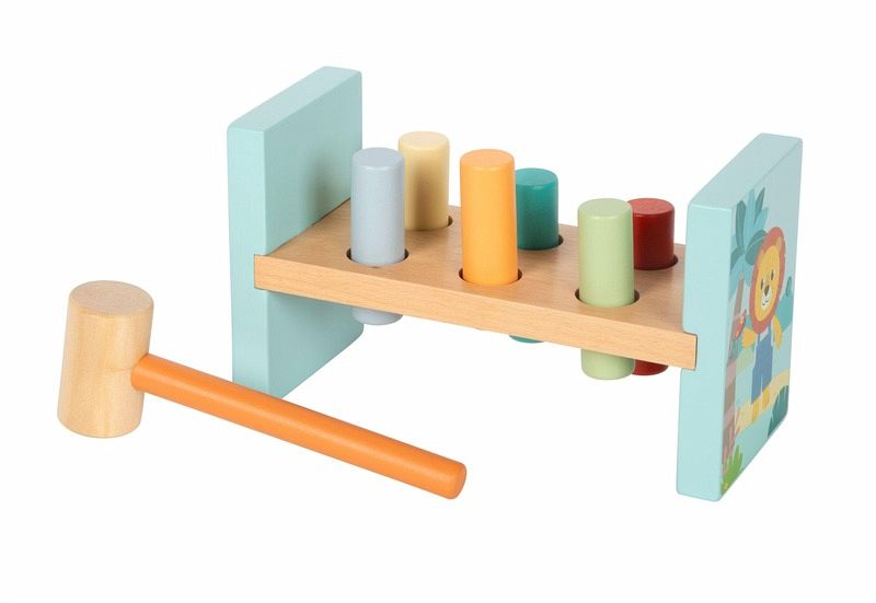 Klopfvergnügen im Dschungel! Dieses liebevoll gestaltete Klopfspiel aus FSC® 100%-zertifiziertem Holz im Jungle Friends-Look bringt tierischen Spielspaß ins Kinderzimmer. Mit dem kindgerechten Hammer werden die farbigen Holzzylinder durch die gummierten Löcher geschlagen dabei trainieren kleine Entdecker spielerisch Motorik und Hand-Augen-Koordination. Ist jeder Zylinder versenkt, wird die Klopfbank einfach umgedreht und der Spaß beginnt von vorn! Ein zeitloser Motorikklassiker, der Lernen und Spaß miteinander verbindet! Das hochwertige Klopfspiel mit fröhlichen Wildtier-Motiven animiert zum aktiven Spielen und fördert dabei wichtige motorische Fähigkeiten. Die gummierten Löcher sorgen dafür, dass die Holzzylinder sicher in Position bleiben, bis sie mit dem beiliegenden Holzhammer durchgeschlagen werden. Die kindgerechte Gestaltung, die ansprechende Farbgebung und der sichtbare Holzanteil machen dieses langlebige Spielzeug zu einem Highlight im Kinderzimmer.