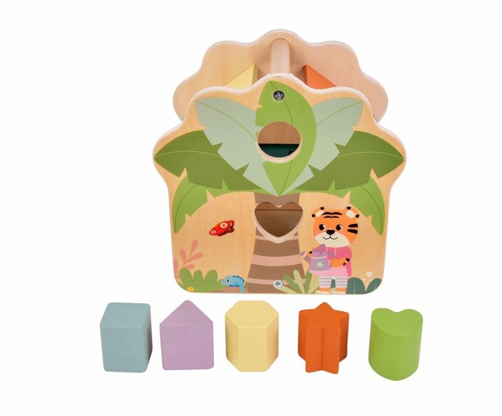 Sortieren, Stecken, Lernen dieser liebevoll gestaltete Steckwürfel in Hausform aus FSC® 100%-zertifiziertem Holz begeistert mit fünf farbigen Stecksteinen, süßen Dschungelmotiven und exotischem Palmen-Print. Die passenden Öffnungen an den Seiten regen zum Zuordnen, Sortieren und Stecken der Steine an. Über die seitliche Klappe können die Steine wieder entnommen werden und der Spielspaß von vorne beginnen. Mit sanften Farben, glatten Kanten und klaren Formen schult das Steckspiel gezielt das Erkennen von Farben und Formen sowie die Feinmotorik. Gleichzeitig werden Geduld, Geschicklichkeit und die Hand-Augen-Koordination gefördert. Das Dach mit Griff erleichtert das Tragen ideal für unterwegs! Das Steck-Haus überzeugt durch sein kindgerechtes Design in Hausform mit liebevollen Illustrationen und fünf harmonisch abgestimmten Stecksteinen. Die passenden Öffnungen an den Seiten regen zum Zuordnen und Sortieren an. Die glatten, abgerundeten Holzelemente garantieren sicheres Spielen und fördern durch die verschiedenen Formen und Farben gezielt das logische Denken sowie die motorische Entwicklung. Beim Stecken üben Kinder wichtige Fähigkeiten wie Greifen, Halten und gezieltes Loslassen. So macht Lernen Spaß!