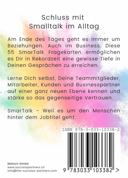 55 Fragen, um jeden Smalltalk in ein spannendes Gespräch zu verwandeln Diese 55 SmarTalk Fragekarten ermöglichen es Dir in Rekordzeit eine gewisse Tiefe in Deinen Gesprächen zu erreichen. Lerne Dich selbst und andere auf einer ganz neuen Ebene kennen und stärke so das gegenseitige Vertrauen. Das SmarTalk Set enthält c.a. 25 berufsbezogene Fragen, weshalb es auch sehr gut für den Austausch im beruflichen Kontext, z. B. beim Onboarding, in Teammeetings oder im Rekrutierungsprozess geeignet ist. SmarTalk - Weil es um den Menschen geht.