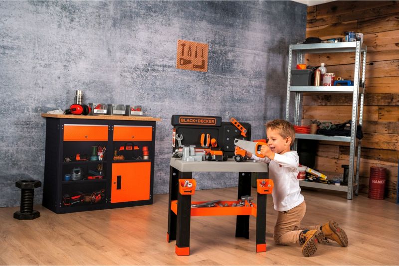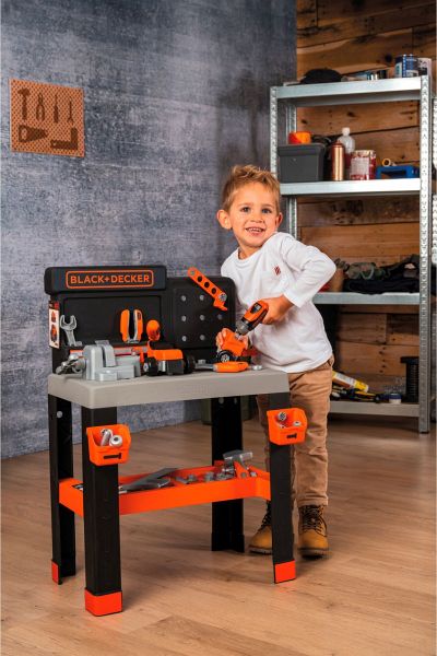 Die große und stabile Werkbank sieht aus wie die echte Werkbank der Eltern. Mit ihr können die Kleinen spielerisch das Handwerk und Werkzeuge kennenlernen. Die große Arbeitsfläche bietet jede Menge Platz für Werkzeuge wie Hammer, Schraubendreher oder Zange.
