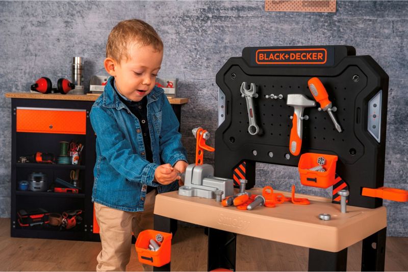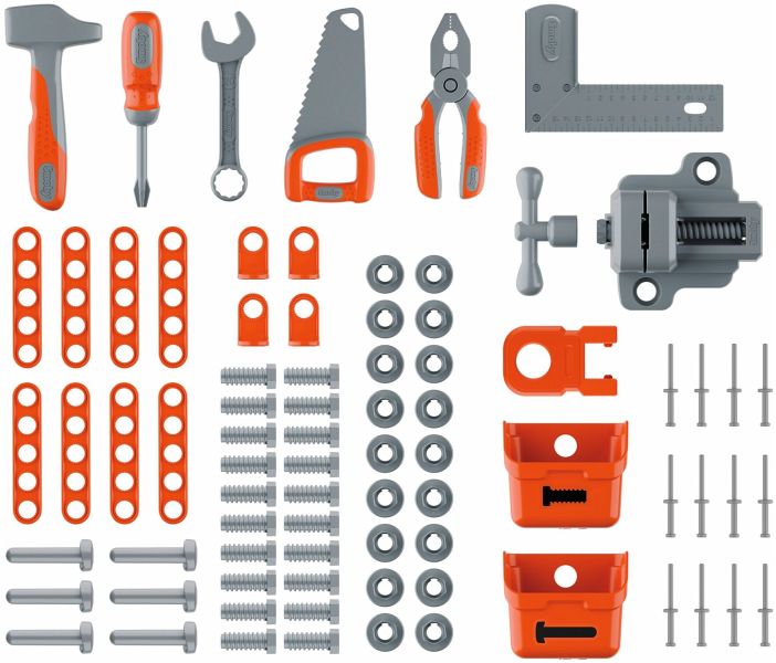 Die große und stabile Werkbank sieht aus wie die echte Werkbank der Eltern. Mit ihr können die Kleinen spielerisch das Handwerk und Werkzeuge kennenlernen. Die große Arbeitsfläche bietet jede Menge Platz für Werkzeuge wie Hammer, Schraubendreher oder Zange.