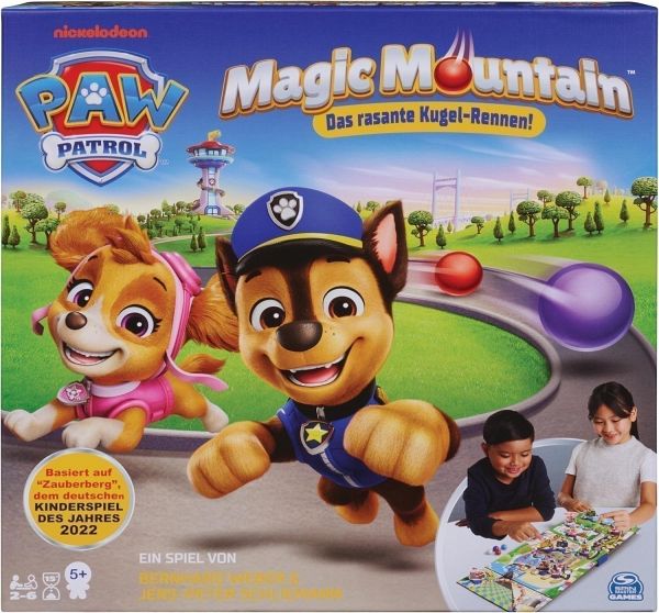 PAW Patrol - Magic Mountain, das rasante Kugel-Rennen: Helft alle zusammen den Hunden der PAW Patrol im rasanten Rennen gegen Bürgermeister Besserwisser und seine Katzen-Bande, Lasst die Kugeln über die schiefe Ebene der Abenteuerbucht rollen und versucht, die PAW Patrol-Figuren zu treffen. Ob Hund oder Kätzchen: Wird eine farbige Kugel von einer Figur gestoppt, springt die Figur aufs nächste Feld der Kugelfarbe. Ihr gewinnt, wenn der 4. Hund ins Ziel kommt - Ihr verliert, wenn das 3. Kätzchen das Zielfeld erreicht Das kooperative Spiel basiert auf „Zauberberg“, dem deutschen Kinderspiel des Jahres 2022. Für 2-6 Spieler*Innen ab 6 Jahren.