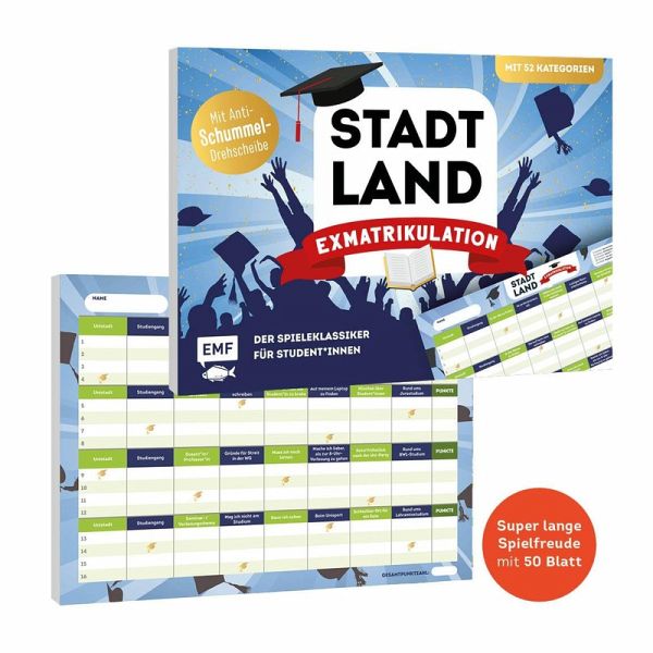 Der Spieleklassiker mit 52 Kategorien rund um das UnilebenDie ultimative Uni-Edition für alle Student_innenMit 50 Blatt und praktischer Anti-Schummel-ABC-DrehscheibeFür jung und alt - von 16-99 Jahren
