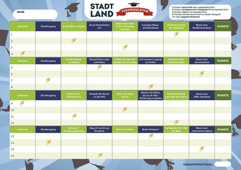 Lustiger Hausarbeitstitel, Mensa-Speiseplan und Gründe fürs Zuspätkommen - fällt dir immer etwas Passendes ein? Nimm die Herausforderung an und lass dich von den vielfältigen Kategorien überraschen. Teste dich und deine Kommiliton_innen - wer von euch hatimmer eine Antwort parat und kann die Kategorien am schnellsten ausfüllen? Faktenwissen, Kreativität und Schnelligkeit sind gefragt, nur so schaffst du es, als erstes "Stopp!" zu rufen. Bist du bereit? Dann ran an die Stifte, fertig, los!