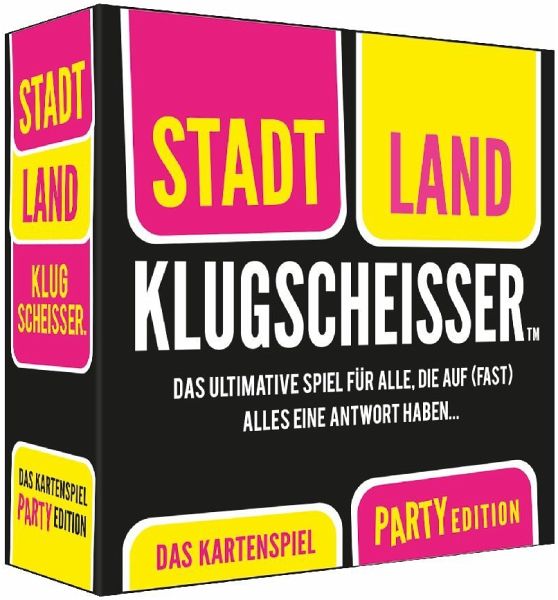 STADT LAND KLUGSCHEISSER - Party Wie lange dauert der kürzeste Flug der Welt? Wie lang ist ein Baby Blauwal? Welche Schätzung trifft es am besten? Diese unterhaltsame Variante des beliebten Spiels KLUGSCHEISSER ist vollgepackt mit über 300 interessanten und verrückten Fragen. Hier geht es nicht darum die korrekte Antwort genau zu wissen, sondern darum der richtigen Antwort durch Schätzen so nahe wie möglich zu kommen. Mach Dich gefasst auf jede Menge absurde Schätzungen und lustige Antworten! Der beste Tipp sichert hier die Punkte. Zeige auch Du, dass in Dir ein echter Klugscheißer steckt! Das perfekte Mitbringsel und ein echter Stimmungsmacher für Familienfeiern, Partys oder gelungene Spieleabende. Ein richtig guter Film? Ein Schimpfwort? Und fällt Dir spontan ein Muss auf jeder Party mit M ein? Wenn ja, dann hast Du wahrscheinlich gute Chancen in diesem Spiel. Stadt, Land, Klugscheisser ist ein wirklich mitreißendes Spiel mit hohem Tempo und Spaßfaktor, das bei allen umgehend für Begeisterung sorgen wird! Ziehe eine Themen- und eine Buchstabenkarte und mach Dich gefasst auf jede Menge lustige Antworten, wenn jeder versucht, schnell einen passenden Begriff mit dem jeweiligen Buchstaben zu nennen. Für jede richtige Antwort wird 1 Punkt vergeben und in jeder Runde wird um insgesamt 3 Punkte gekämpft. Besonders schnelle Spieler haben auch die Chance, den ultimativen Klugscheißer-Bonus zu gewinnen! Ein tolles Geschenk und das perfekte Mitbringsel für jede Gelegenheit, lustige Partys und tolle Spieleabende mit Freunden.