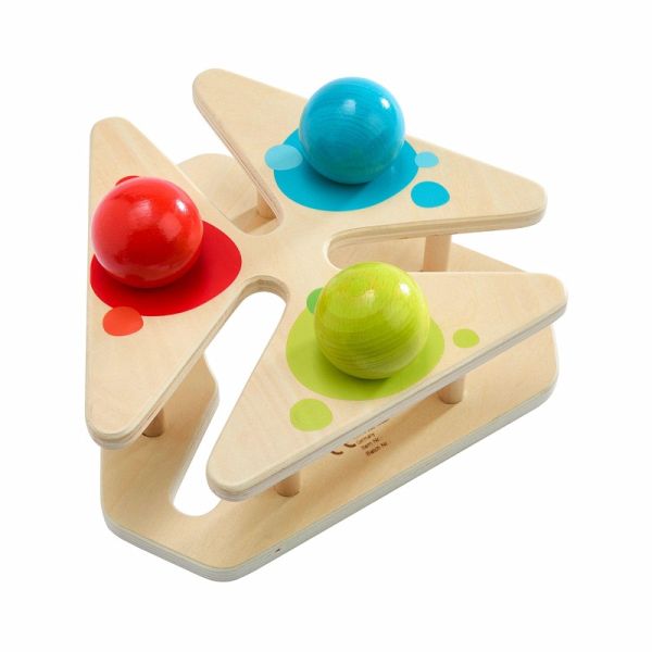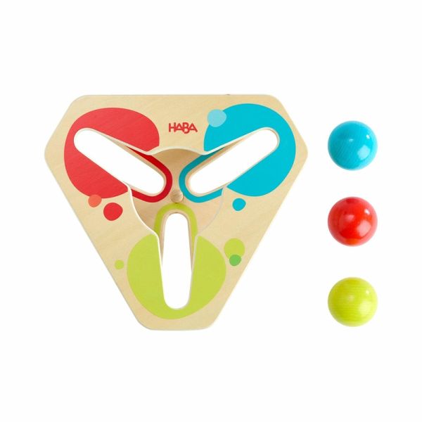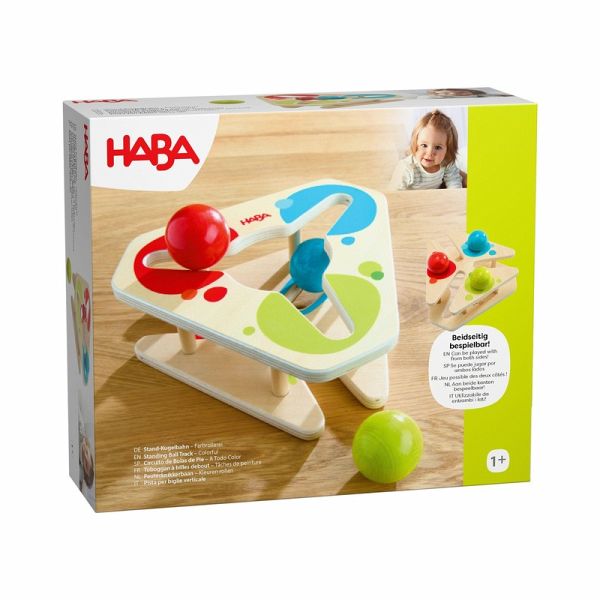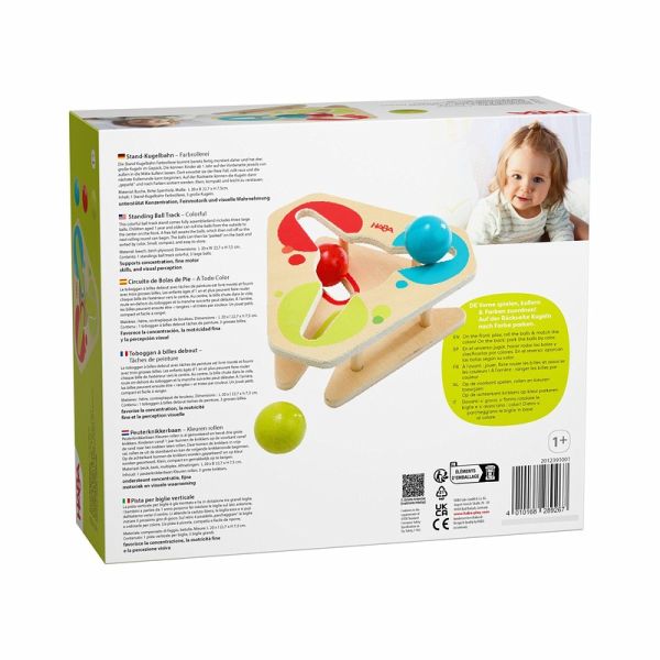 Auspacken und sofort losspielen! Die Stand-Kugelbahn Farbrollerei kommt bereits fertig montiert daher und hat drei große Kugeln im Gepäck. Die können Kinder ab 1 Jahr auf der Vorderseite jeweils von außen in die Mitte kullern lassen. Dort erwartet sie der freie Fall und die nächste Kullerrunde kann beginnen. Auf der Rückseite können die Kugeln dann geparkt und nach Farben sortiert werden. So geht nichts verloren: klein, kompakt und leicht zu verstauen.