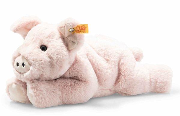 Das 28 cm große, liegende Piko Schwein mit seinem dichten, etwas längeren Plüsch schmeichelt kleinen Händen. Seine Augen glänzen, die knuffigen Ohren, die typische Schnauze und die Hufe sind mit weißem Frotteestoff abgesetzt. Piko Schwein liegt durch ein Granulatsäckchen in der Körpermitte sehr gemütlich, sein weich gestopfter Körper legt sich in hübsche Falten.