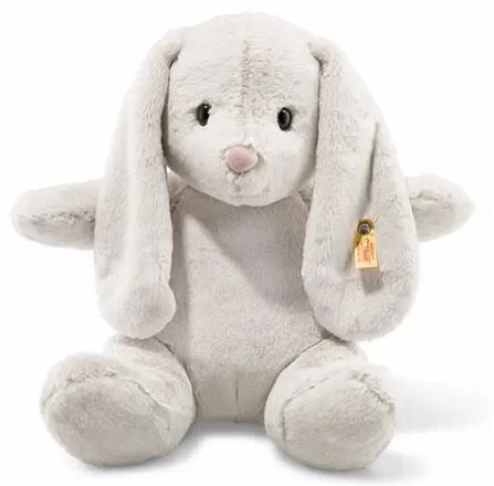 Die eingearbeiteten Granulatsäckchen am Gesäß, den Pfoten und den Sohlen sorgen für einen sicheren Halt. Der weiche und dichte Plüsch in zartem Hellgrau lädt zum Anschmiegen und Liebhaben ein. Mit diesem Kuschelhasen kann man prima das Greifen und Tasten lernen. Und in den Ruhepausen legt Hoppie Hase seine überlangen Ohren über das Gesicht seines Menschenfreundes und flüstert ihm wunderschöne Einschlafgeschichten zu.