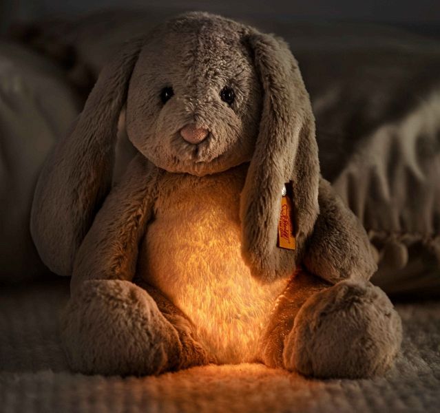 Mit ihren hübschen Schlappohren und ihrem kuschelweichen Plüsch ist Hoppie Hase besonders niedlich. Dank des warmweißen Lichts, das sich in ihrem Bauch befindet und sanft durch sie hindurchscheint, ist sie eine wunderbare Einschlaf-Hilfe. Das Licht hat drei Modi. Bei „ON“ wird es durch Drücken auf den Bauch aktiviert und bleibt bis zu einem erneuten Drücken eingeschaltet. Der Modus „TIMER“ sorgt dafür, dass das Licht nach 30 Minuten erlischt. Ausschalten lässt es sich im Modus „OFF“. Das Nachtlicht kann aus Hoppie entnommen und geladen werden. Ist die Ladung vollständig (Ladekontrollleuchte leuchtet grün, bei rot wird noch geladen), kann es bis zu acht Stunden am Stück leuchten. Das Nachtlicht ist mit einem handelsüblichen USB C Ladekabel aufladbar, welches nicht im Lieferumfang enthalten ist.