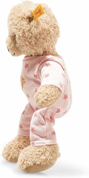 Das kleine 25 cm große Teddybär Mädchen in Beige ist aus Plüsch für babysanfte Haut gefertigt. Das kleine Schnäuzchen, die Sohlen und die Pfoten sind in beigefarbigem weichen Material gehalten. Die kleine schwarze Bärennase und der lächelnde Mund sind in Schwarz garniert. Der Schlafanzug ist rosa mit dunkelrosa bedruckten Sternen und gestickter Teddybärenkopf-Applikation in Beige. Der Schlafanzug kann ausgezogen werden.