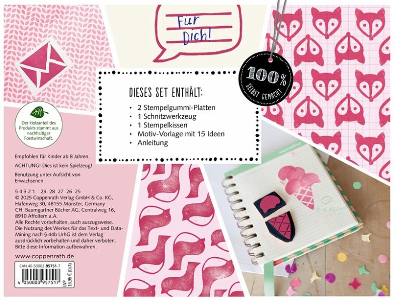 Alles-drin-Starter-Set für individuelle Stempel zum Selbermachen mit Stempelplatten, Schnitzwerkzeug, Anleitung, 15 Vorlagen und Stempelkissen zum Sofort-Loslegen.