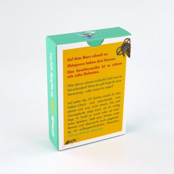 Oktopusse haben drei Herzen, auf dem Mars schneit es, Bananen sind radioaktiv und eine Gewitterwolke ist so schwer wie zehn Elefanten. Was davon stimmt wirklich? Und was ist frei erfunden? Bei diesem spannenden Kartenspiel können Kinder nicht nur unglaublich viel lernen, sondern werden selbst zu Fakten-Checkern. Auf jeder der 55 Karten befinden sich zwei außergewöhnliche und interessante Texte. Ob allein oder als Gruppe - es gilt herauszufinden, welche der beiden Aussagen wahr ist und welche falsch. Das perfekte Spiel für neugierige und wissensdurstige Kids.