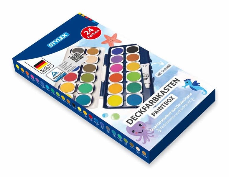 24er Schuldeckfarbkasten mit einer Tube Deckweiß ohne Pinsel. Der Deckel ist zum Abnehmen und bietet ein leichtes Öffnen und Schließen. Es gibt 6 integrierte runde Mischfelder mit auswechselbaren eckigen Farbnäpfen in einer Faltschachtel. Für Kinder ab 6 Jahren.