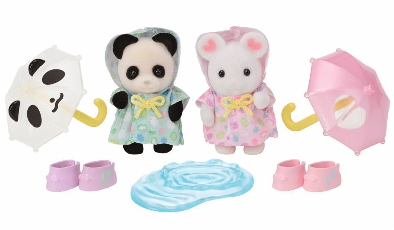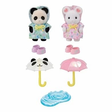 Heute regnet es in Sylvanian Village, aber die beiden Babys sind gut ausgestattet, um trocken in den Kindergarten zu kommen. Das Panda Baby und das Marshmallow Maus Baby tragen einen Regenmantel, Regenstiefel und jeweils einen Regenschirm. Sie lieben es, im Regen durch die Wasserpfützen zu springen. Im Sylvanian Families Erlebniskindergarten Freunde "Regenwetter" Figurenset sind zwei Baby Figuren mit Regenmantel, Regenstiefel und Regenschirm und eine Wasserpfütze enthalten. Die Figuren sind ca. 4 cm groß, Kopf, Arme und Beine sind beweglich. Für Kinder ab 3 Jahren geeignet.