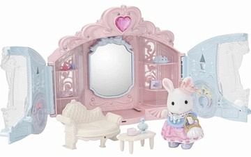 Hereinspaziert ins elegante Ankleidezimmer von Sylvanian Families. Dieses zauberhafte Spielzeugset enthält eine wandelbare Kutsche, wunderschöne Accessoires und ein Schneehasen-Mädchen im Prinzessinnenkleid.