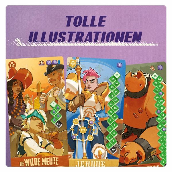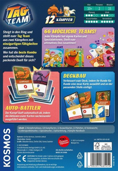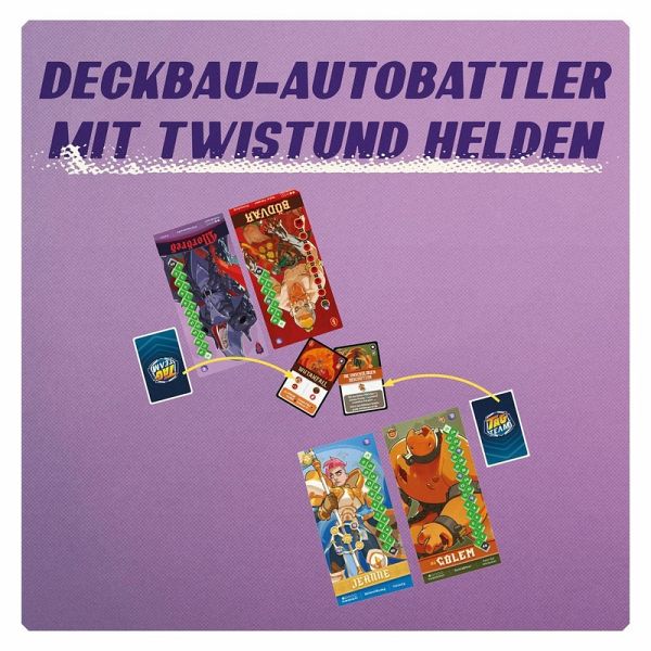 Taktisches 2er-Spiel: Wer gewinnt beim Autobattler mit Twist? Einfache Regeln, viel Abwechslung durch 12 unterschiedliche Kämpferinnen und Kämpfer! Neue Karten gezielt ins Deck einbauen und die Karten des Gegenübers einschätzen. Auf in den Ring: Welches Tag Team gewinnt das Duell? Im spannenden 2er-Spiel stellen sich die beiden Spielerinnen und Spieler je ein Tag Team aus zwei Kämpferinnen und Känpfern zusammen. Mit deren kombinierten Kartendecks treten sie Runde für Runde gegeneinander an, indem immer die oberste Karte aufgedeckt und die Effekte ausgelöst werden. Autobattler mit einfachen Regeln und Twist erleben: In jeder Runde wird dem Deck gezielt eine neue Karte hinzugefügt. Die Reihenfolge der Karten wird dafür nicht durchgemischt. Welche Karten treten jetzt wohl gegeneinander an? Das eigene Deck optimieren, die Karten des Gegenübers einschätzen und Angriffe möglichst gekonnt blockieren: ein lustiges Duellspiel ab zehn Jahren mit überraschenden Wendungen und großem Wiederspielreiz durch 12 individuelle Kämpferinnen und Kämpfer!