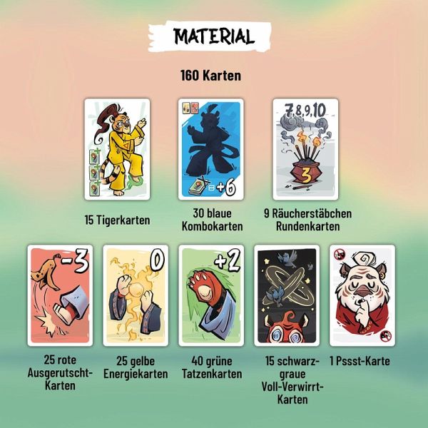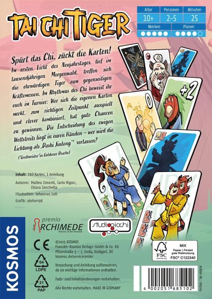 Welcher Tiger wird Großmeister des Tai-Chi-Wettbewerbs? Wer die schönsten Figuren und Kombos tanzt, gewinnt den Wettstreit. Ein atmosphärisches Kartenspiel mit vielen spannenden Herausforderungen für zwei bis fünf Spielerinnen und Spieler ab zehn Jahren.