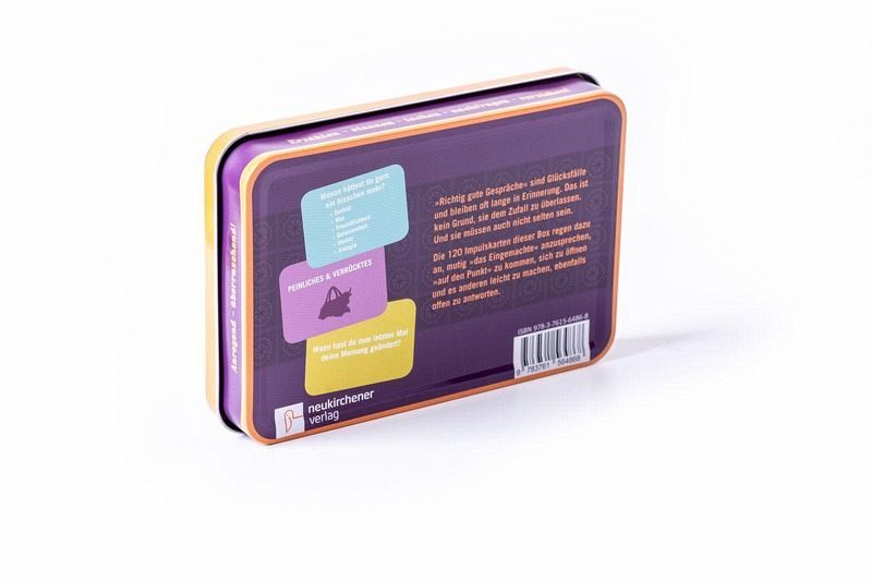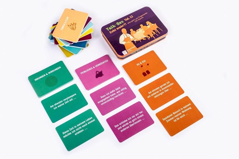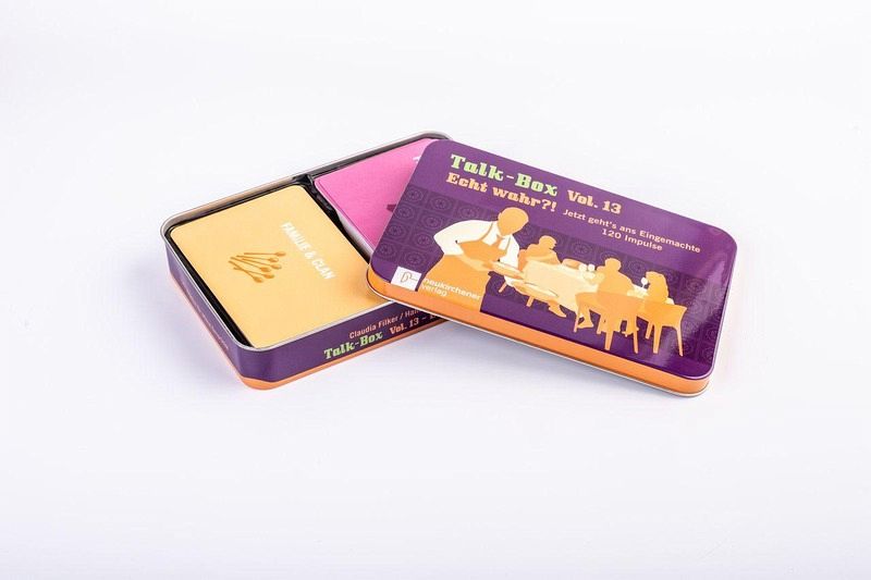 Die neue Talk-Box Vol. 13 enthält 120 Impulskarten mit spannenden Fragen und Themen, durch die man einander besser kennenlernen und tiefere Gespräche entwickeln kann:Kategorien:- Du & Ich- Ich & Über(m)ich- Leib & Leben- Geld & Peanuts- Abschiede & Verlorenes- Peinliches & Verrücktes- Abgründe & Höhenflüge- Familie & Clan- Irrungen & Wirrungen- Stolz & Vorurteil- Ansichten & EinsichtenSie lässt sich ideal innerhalb von Gruppen, auf einer Feier oder Veranstaltung oder auch mit Freunden zu Hause am Küchentisch einsetzen und spielen.