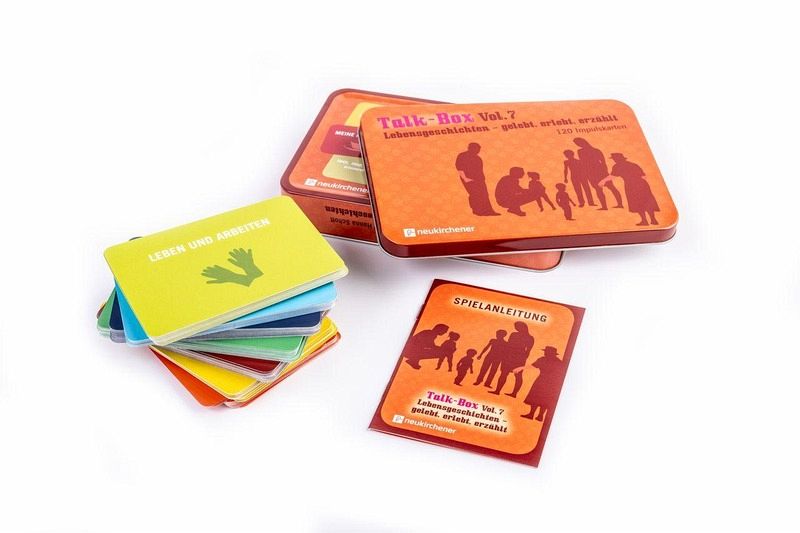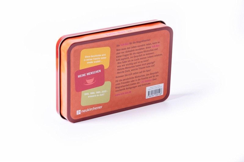 In dieser neuen Talk-Box gibt es 120 neue Impulse für angeregte Gesprächsrunden rund um die Lebensgeschichten der Teilnehmer. Ob in der Familie, unter Freunden oder in der begleitenden Biographiearbeit, sowohl von den Mitspielern als auch von sich selbst erfährt man erstaunliche Dinge.