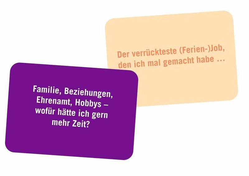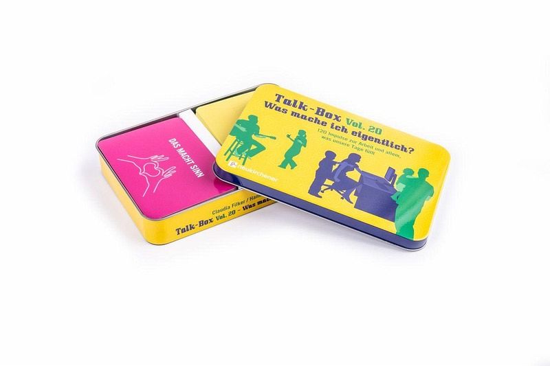 Egal, ob wir am Ende eines Tages uns selbst fragen "Was mache ich eigentlich den ganzen Tag?" oder in einer entspannten Feierrunde neuen Bekannten die Frage stellen "Und - was machst du so?" - immer geht es darum: Was füllt eigentlich unsere Tage aus? Womit verdiene ich mein Geld? Was stresst, was begeistert mich? Was erlebe ich als zutiefst sinnvoll? Und welches Ehrenamt würde ich gern mal ausprobieren? Es geht um nicht weniger als den großen Teil unseres Lebens, den wir mit Arbeiten und Beschäftigsein verbringen.Die 120 Impulskarten von Talk-Box Vol. 20 bringen ungezwungen und spielerisch über diese Themen ins Gespräch. Dabei geht es um jede Art von Arbeit, die unsere Zeit (er)füllt - ob Beruf, Care-Arbeit oder Ehrenamt - und auch um die berühmte Work-Life-Balance.Dabei ist es egal, ob man sich als Team oder Freund:innen schon lange kennt oder in einer Fortbildungs- oder Seminarrunde bunt zusammengewürfelt ist: Talk-Box-Runden funktionieren ganz unkompliziert - mit viel Spaß für alle Teilnehmenden und jeder Menge neuen Erkenntnissen über Mitmenschen und sich selbst.Kreative Gesprächsimpulse für: Freundeskreise und Abende mit Bekannten, Kolleg:innen und im beruflichen Kontext, Gemeindegruppen und Hauskreise, Seminargruppen, Berufsschulen und Studierendengruppen, Therapie- und Seelsorgegespräche oder Lifecoaching