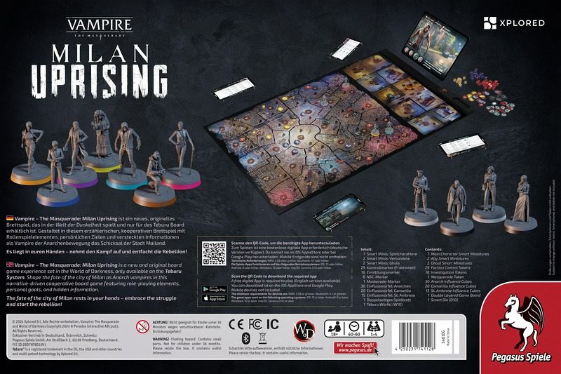 Vampire: The Masquerade - Milan Uprising ist ein kooperatives Miniaturen-Brettspiel, das in der Welt der Dunkelheit spielt und ausschließlich für das Teburu-System erhältlich ist. In diesem erzählenden Brettspiel schlüpfen die Spielenden in die Rollen der Anarchen-Vampire von Mailand, die gegen die Unterdrückung durch die herrschende Vampirsekte - die Camarilla - um Autonomie kämpfen. Vor dem Hintergrund einer sich ständig verändernden politischen Lage navigieren sie durch eine Vielzahl von Hindernissen, bis hin zur finalen Konfrontation mit dem tyrannischen Camarilla-Prinzen Prospero. Durch die auf die verschiedenen Charaktere individuell zugeschnittenen Möglichkeiten, mit Situationen umzugehen, werden sowohl unmittelbare als auch dauerhafte Konsequenzen in Gang gesetzt, die jeden Spielverlauf einzigartig machen. Das Spiel bietet Rollenspielelemente, persönliche Ziele und verborgene Informationen und wird mit intelligenten Miniaturen und Würfeln sowie einem detaillierten Spielbrett geliefert. Zum Spielen werden außerdem das separat erhältliche Teburu-Board, mindestens ein digitales Endgerät und die kostenlose Begleit-App benötigt. Das innovative Teburu-System verfolgt jede Handlung auf dem intelligenten Spielbrett und bereichert das Spielerlebnis um künstliche Intelligenz für Feind_innen, lebendige Grafik, aufregende Klänge und dramatisches Storytelling. Die kostenlose digitale App kann im iOS AppleStore oder bei Google Play heruntergeladen werden. Mobile Endgeräte sind nicht enthalten. Technische Anforderungen: RAM: 2 GB oder größer, Bluetooth: 4.1 oder höher. Die Spiele-Apps funktionieren auf folgenden Betriebssystemen: iOS: 13 oder höher. Android: 8 oder höher. Windows: 10 oder höher. macOS: Sonoma (14) oder höher.