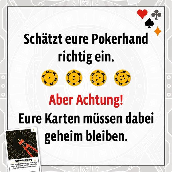 - Bloß kein Pokerface machen! Versucht die Karten der Anderen und somit eure eigene Position im Ranking einzuschätzen. Mit der Wahl des dazu passenden Chips könnt ihr eure Vermutung den anderen Spielerinnen und Spielern mitteilen. Aber Achtung! Es dürfen keine Informationen über die Handkarten ausgetauscht werden!