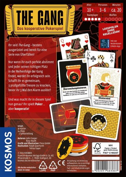 Die berüchtigte „The Gang“ plant eine Serie an Überfällen und muss drei Tresore knacken, bevor der Alarm dreimal ausgelöst wird. Perfekte Abstimmung und richtige Platzierung in der Gang sind entscheidend. Drei bis sechs Spielerinnen und Spieler ab zehn Jahren können diese Herausforderung annehmen und kooperativ Poker spielen. Dabei dürfen sie allerdings nicht über ihre Handkarten sprechen.Ein spannendes Spielerlebnis basierend auf dem bekannten Pokerprinzip mit Pokerchips und cool gestalteten Karten.